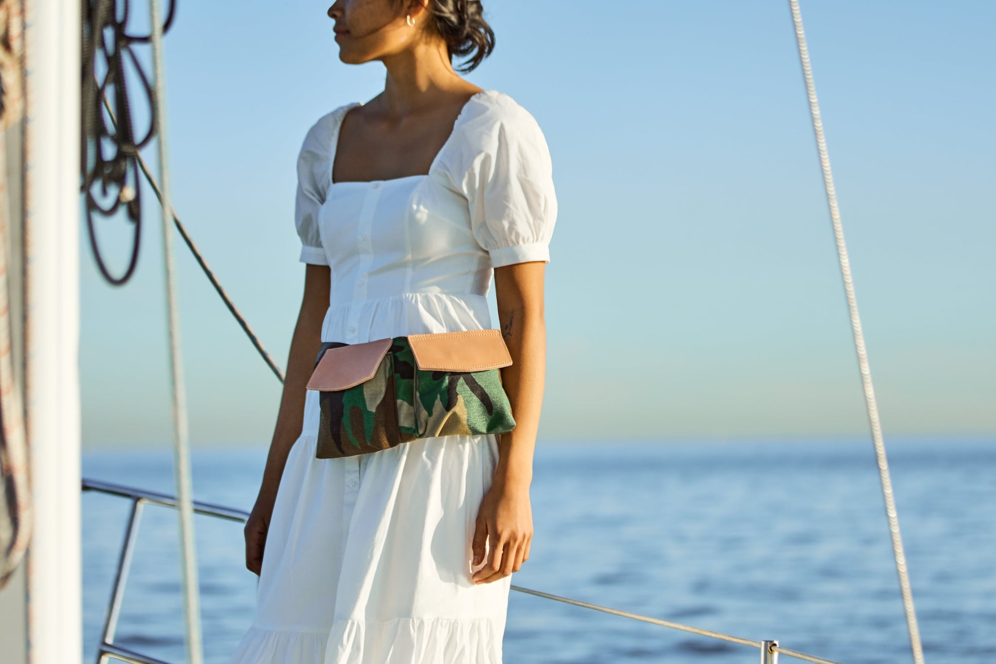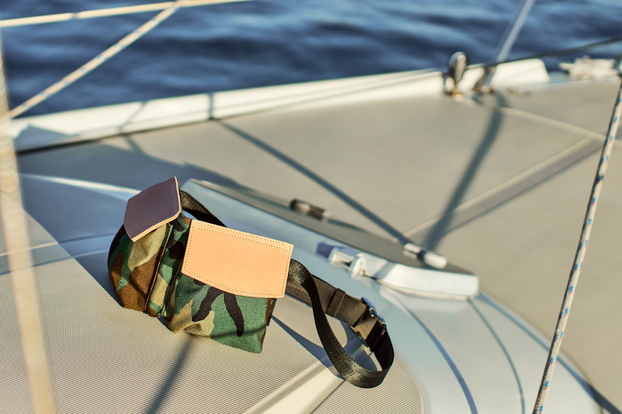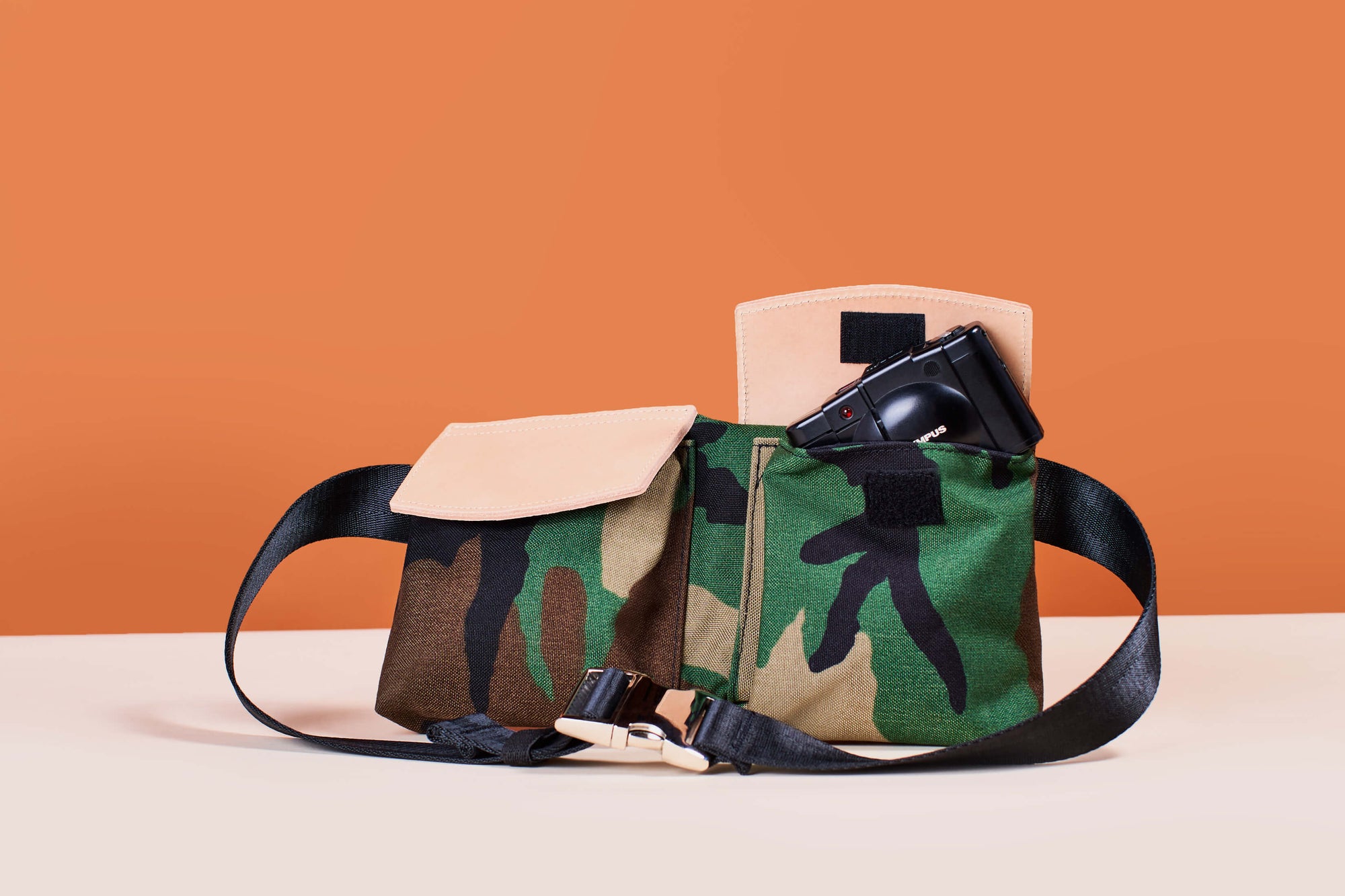 Made from durable waterproof nylon with vegetable-tanned Vachetta leather flaps, and a sturdy polished aluminum buckle. Two exterior easy access velcro pockets on the front and a zipper pocket on the back. Handmade in the USA.